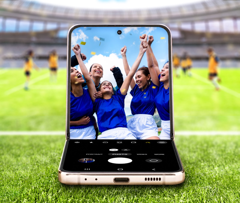 Capture and share all the game day highlights in vivid detail with your Galaxy Z Flip4. With FlexCam[1], you can enjoy hands-free capture by folding your device to serve as a tripod.