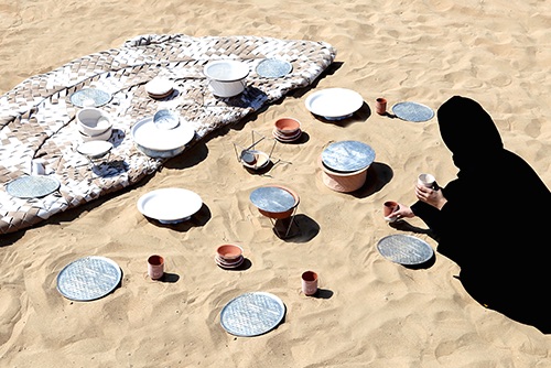 Lastly, ‘Constructed Feast’, developed by three designers from Tinkah, a multi-disciplinary design firm founded by UAE-based artists, draws inspiration from nomadic Bedouin dining experiences, and beautifully depicts their ceremony of eating.