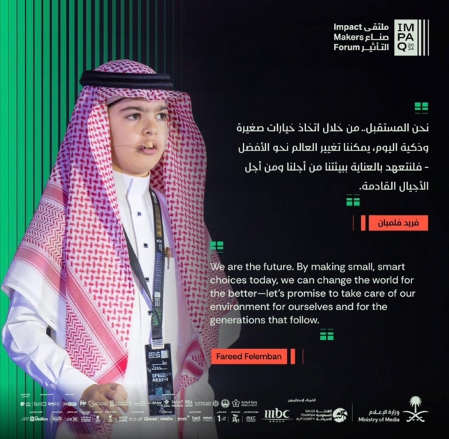 Nine-year-old Fareed Mohammed Felemban, a student of global online education platform 51Talk, delivered a compelling speech at the inaugural Impact Makers Forum, marking a significant milestone as the event's youngest speaker. The young environmental advocate from Jeddah, who previously spoke at COP29, showcased the emerging influence of Saudi Arabia's next generation on the global stage.