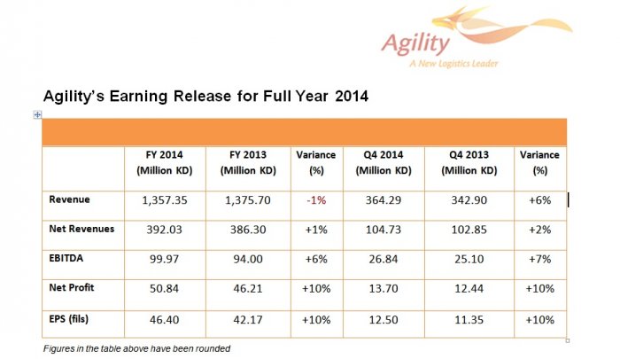 Agility today announced its full-year 2014 financial results, reporting a net profit of KD 50.84 million, or 46.40 fils per share, an increase of 10% over the same period in 2013. Revenues for the year stand at KD 1.36 billion. EBITDA stands at KD 99.97 million, a 6% increase compared to FY 2013.