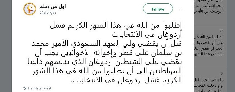 Al-Sheikh urged all Saudi believers that, in order to help the Prince to put the last nail in coffin of Qatar and The Muslim Brotherhood’s supporters, first of all, we should get rid of Erdogan, the supporter of these devils. Therefore, pray for this important in Ramadan.