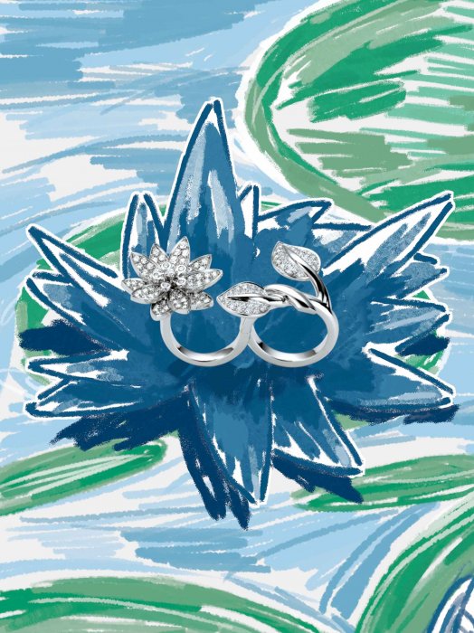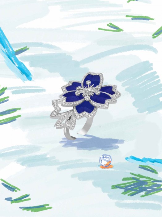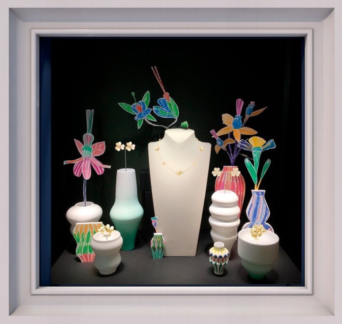 The Maison is collaborating with Alexandre Benjamin Navet, winner of the Grand Prix Design Parade Toulon Van Cleef & Arpels in 2017. The French artist has explored the world of flowers for the first time, bringing plant shapes and dazzling colors into bloom in the window displays of Van Cleef & Arpels’ boutiques. Recreating a sketchbook feel, the project will continue through the year with a large-format interior design concept: a joyful blend of pastel drawing and architecture.