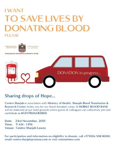 Centro Sharjah in lines with its corporate social responsibility program (CSR) is organising a blood donation drive at the hotel in collaboration with Sharjah Blood Transfusion & Research Center. Colleagues, Guests & Friends are collectively invited to share these drops of HOPE and get involved as #CentroGoesRed