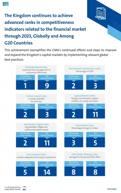 The Kingdom ranked first in the Corporate Boards index among G20 nations and second in the capital markets index, stock market capitalization index (as a percentage of gross domestic product), shareholders' rights index, and venture capital index.