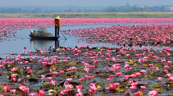 The flowers of the Red Lotus Sea in Kum Pavapi district of Udon Thani are usually in full bloom from New Year till around February. Tourists can hire a boat to see the red lotus up close and enjoy the natural scenery of the fresh water lake and waters, which are home to a variety of fish, birds, wildlife and aquatic plants