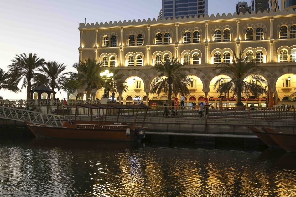 Al Qasba’s architecture also allows visitors to look over to the Dubai skyline, with water canal linking the Khalid and Al Khan Lagoons.