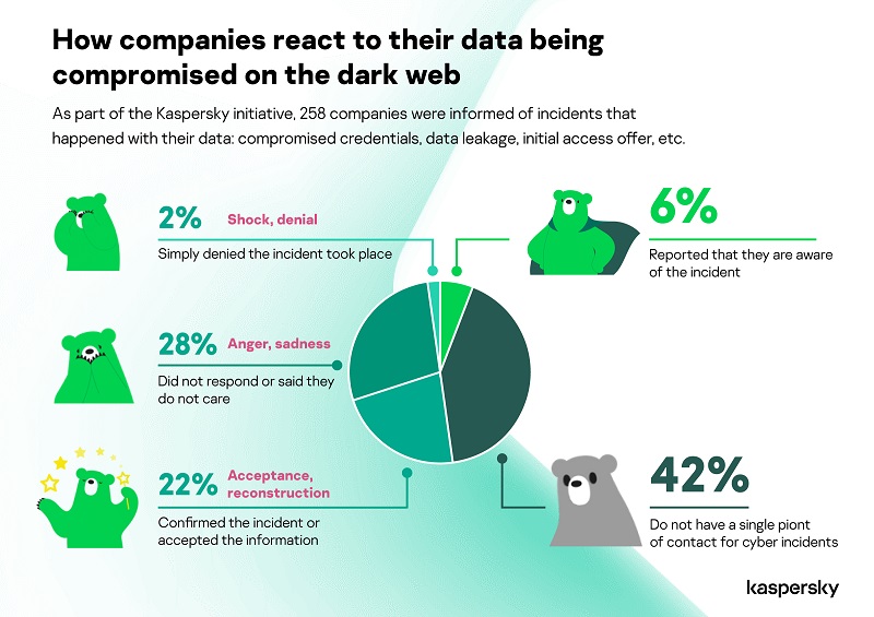 “The results of our initiative about how companies react to the fact that their data is compromised on the Darknet are rather discouraging: reactions of only a third (27%) of the companies can be called adequate to the situation, while the rest are stuck in a firestorm of emotions – from ignorance to denial and helplessness,” comments Yuliya Novikova, Head of Digital Footprint Intelligence. “While Darknet monitoring seemed to be complicated previously, currently the situation is changing. Darkweb monitoring should be considered a threat intelligence data source for cybersecurity staff – CTI analysts, SOC analysts, and others. It will allow to immediately react on security incidents such as offers on selling access to the company or data leakages and help to prevent data breaches. Digital Footprint Intelligence introduced within the Kaspersky Threat Intelligence portal provides access to insights from a range of validated sources worldwide, allowing companies to mitigate the impact of cyberattacks and identify potential threats before they become incidents.”