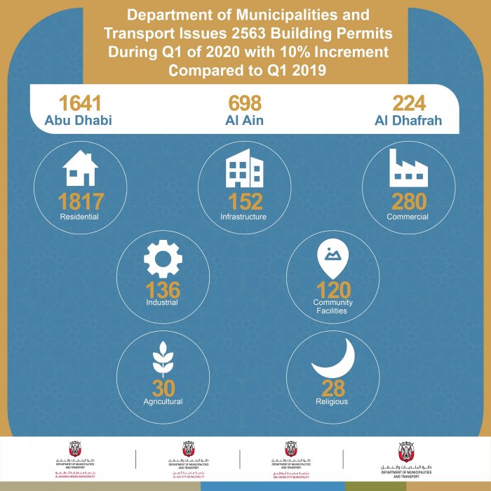 According to the Building Permits Performance Report issued by Department of Municipalities and Transport, the number of building permits issued by the Municipality of Abu Dhabi City reached 1641 permits for various sectors and institutions, governmental, residential, commercial, governmental services, religious, social, cultural or other services.