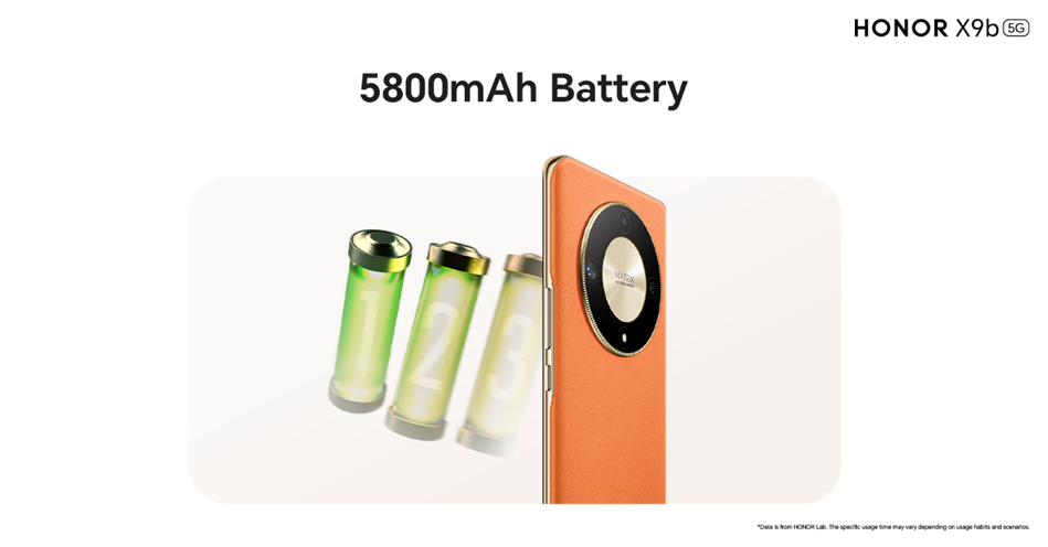 The HONOR X9b 5G comes with a large, yet light and thin 5800 mAh[1] battery that can support up to three days of use, so you can rely on the HONOR X9b 5G for a worry-free experience in any scenario.