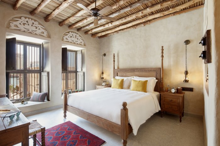 The 22 homes are located in small clusters of 2 to 3 buildings joined by a bridge that provides a walkway above the souk and sharing a common courtyard, encouraging socialising with other guests within the hotel. The design of the twin and king-bed guest rooms draw deeply on the UAE’s culture, with authentically aged materials that mimic rustic facades; and interiors that reflect an age of pearl diving, trading and crafts.