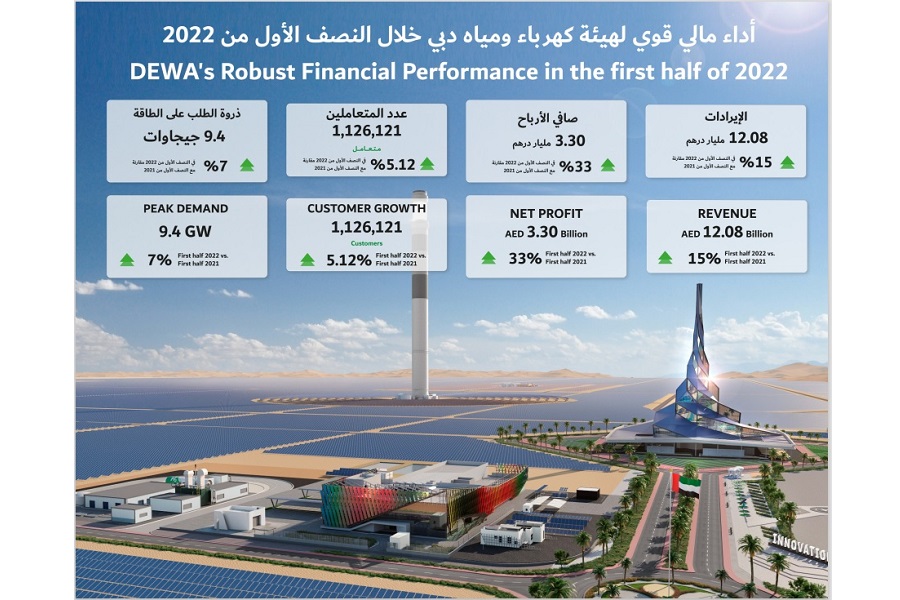 Dubai Electricity and Water Authority PJSC (ISIN: AED001801011) (Symbol: DEWA), the Emirate of Dubai’s exclusive electricity and water services provider, which is listed on the Dubai Financial Market (DFM), today reported its second quarter 2022 financial results, recording quarterly revenue of AED 7.01 bn and net profit of AED 2.61 bn. For the first half of 2022, DEWA’s revenue is AED 12.08 bn and net profit is AED 3.30 bn.