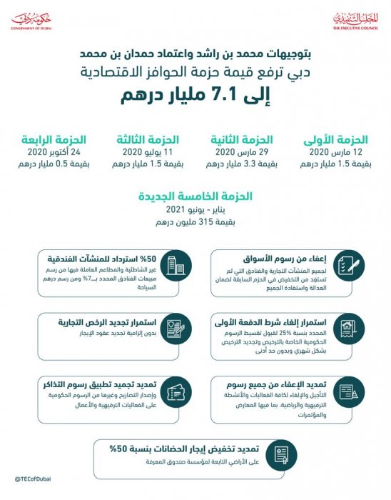 The decision to launch the new stimulus package is based on the recommendations of the Dubai Economy Support Committee, chaired by H.H. Sheikh Ahmed bin Saeed Al Maktoum, Second Deputy Chairman of The Executive Council, to continue supporting all economic and business sectors in Dubai. The AED315 million package extends the validity of some of the initiatives announced in the previous stimulus packages for another six months, starting from January 2021 until June 2021.