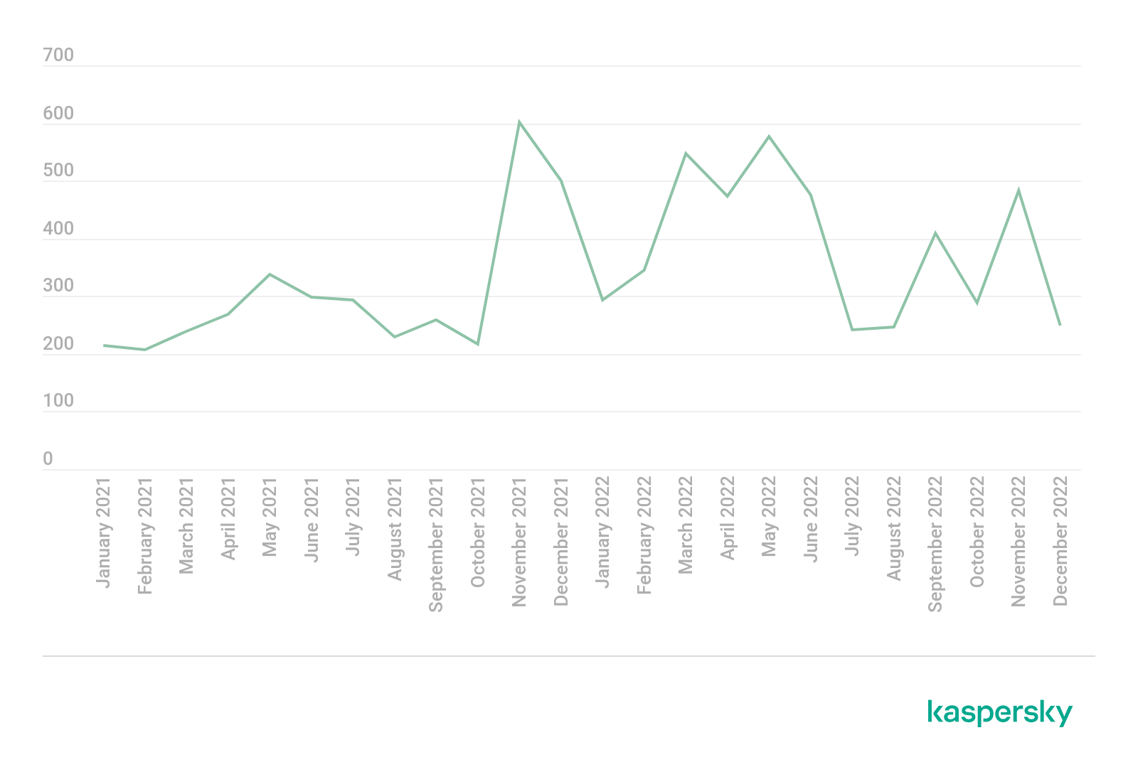 Ransomware actors are increasingly posting about new successful hacking incidents perpetrated on businesses in their blogs – the number of such publications grew in 2022. The peak number exceeded 500 per month, and this occurred several times between the end of 2021 and the first half of 2022. This compares to 200 to 300 posts observed monthly by experts at the beginning of 2021. Extortionists were also active at the end last year: in September and November, Kaspersky’s Digital Footprint Intelligence tracked roughly 400 and 500 posts, respectively.