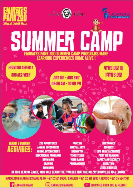 Emirates Park Zoo & Resort's ongoing registration for its summer camp is open from 9:00 am to 6:00 pm from Saturday to Thursday, offering exciting programs that provide fun and educational activities for young campers, emphasizing teamwork, respect, edutainment, and responsibility.