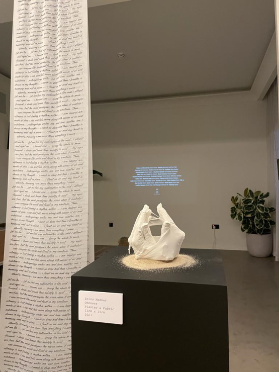True to Hana’s style, “A Tribute” captured the beauty of human interactions in the absence of inhibitions. The exhibition demonstrated an installation of ink on the fabric of a poem written by Hana El Sadek and a sculpture of plaster and fabric by Zeina Madwar, both amplifying the experience and heightening the film's impact on the audience.
