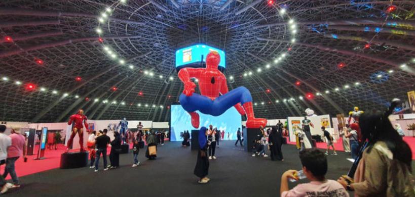 A giant Spider-Man has been suspended from the conference hall ceiling and other life-size figurines on show include the characters Iron Man, War Machine, and Black Panther.