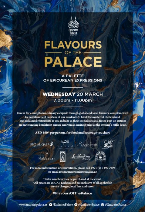 Join us for an evening filled with entertainment and irresistible delights on our spectacular West Wing Gazebo. Meet our chefs and sample their signature dishes at the pop up restaurant stands of BBQ Al Qasr, Hakkasan, Le Vendôme, Mawal, Mezzaluna, Mezlai and Sayad followed by decadent confections prepared exclusively for the evening by our Executive Pastry Chef. Enjoy lively entertainment and a chance to win one of our exciting prizes in the raffle draw.
