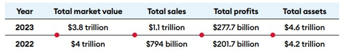 In 2023, the aggregate market value of the 100 listees decreased marginally by 5%, from $4 trillion in 2022 to $3.8 trillion. However, the aggregate sales value for these 100 companies has jumped 38.5% to $1.1 trillion, with profits surging by 37.7% to hit $277.7 billion. The value of their aggregate assets has also risen by 9.5% to $4.6 trillion as of 2022 end.