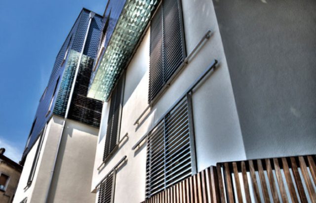 The Flat Bar sliding shutter system was recently applied in a housing complex in Brescia, Italy, where the sliding shutters fit in perfectly thanks to their slim construction.