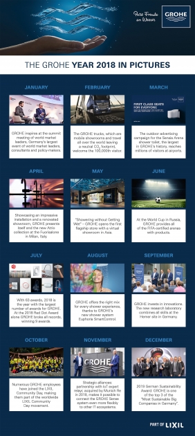 GROHE's commitment to smart, water-saving technologies has been acknowledged and appreciated. For example, at this year's German Sustainability Award, the brand was voted among the top 3 “most sustainable big companies in Germany” for the third time. In addition, with 63 design awards, 2018 is the most award-winning year in GROHE's history.