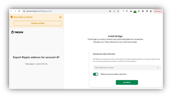 Trezor Connect: confirming the connection to the scam site
