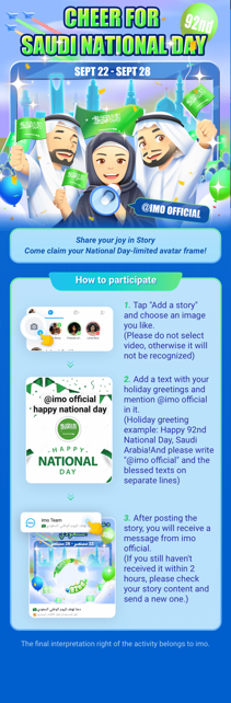 "As a Saudi, the National Day is one of the days we look forward to as we proudly raise the flag to show the world,” said imo user Turki who was born and raised in Dammam Saudi Arabia. “As an imo user for years, being able to use this National Day feature with the flag shocked me. I was very excited and I sent it literally to everyone I know – it is little gestures like this that make me feel grateful and appreciative of both imo and the country that I am proud to call home."