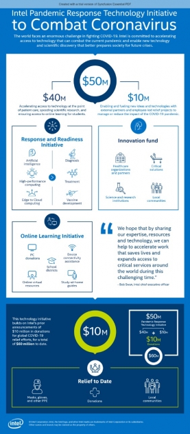 Coronavirus Relief to Date: This technology response initiative builds on Intel’s prior announcements of $10 million in donations that are supporting local communities during this critical time. Those donations include 1 million gloves, masks and other equipment for healthcare workers, $6 million from the Intel Foundation toward relief efforts in local communities and $4 million from Intel and its subsidiaries around the globe.