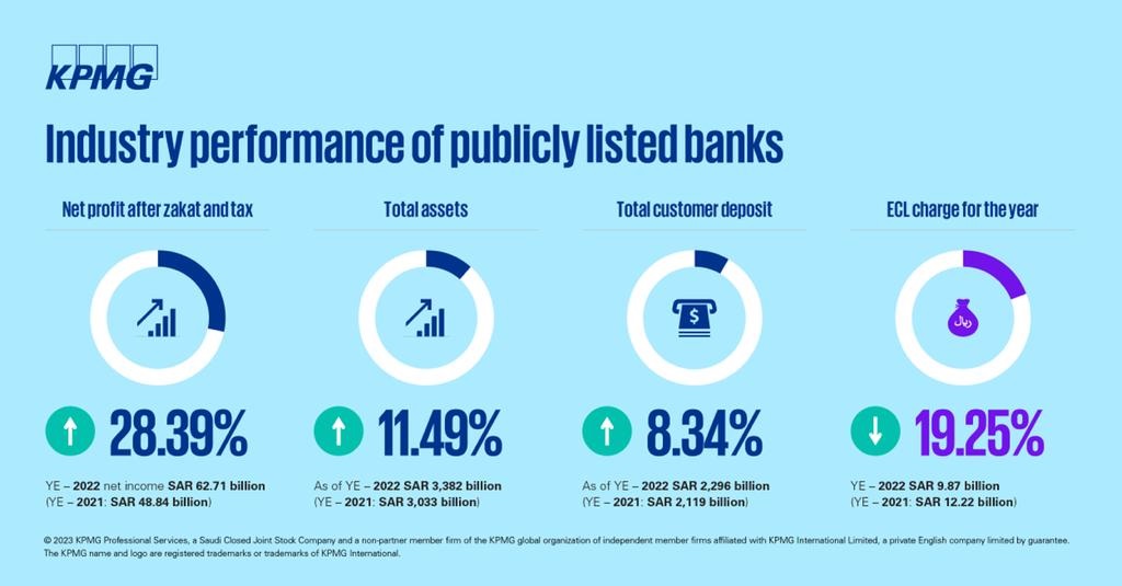 With the global banking industry making headlines in the past weeks, the Saudi banking sector published its annual results for 2022. According to KPMG, a leading provider of audit, tax and advisory services, in its annual market update, the consolidated numbers for the ten Tadawul-listed banks reflect a robust performance, particularly indicating an increase in net profit by 28%, reaching SAR 62.71 billion ($16.7 billion). The growth trajectory is expected to continue on account of consistent demand for public and private sector financing and the availability of non-interest-bearing deposits.