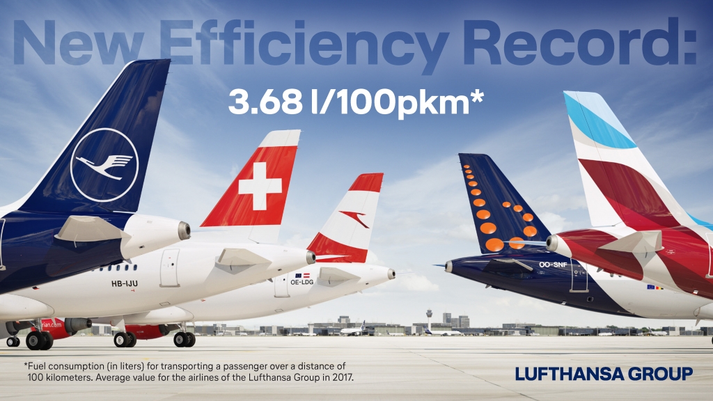 The Lufthansa Group has set a new fuel efficiency record. In 2017, the aircraft of the passenger fleets required an average of just 3.68 liters of kerosene to transport a passenger 100 kilometers (2016: 3.85 l/100 pkm). This represents an improvement of 4.5 percent compared to the previous year. The Lufthansa Group has thus more than satisfied the airline industry target of annual efficiency gains of 1.5 percent. All airlines belonging to the Group contributed to this achievement.