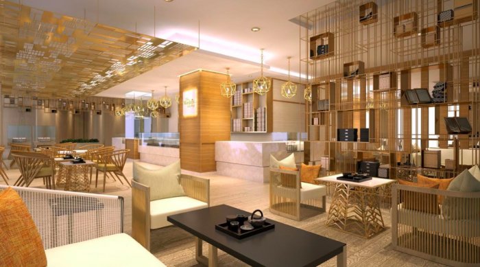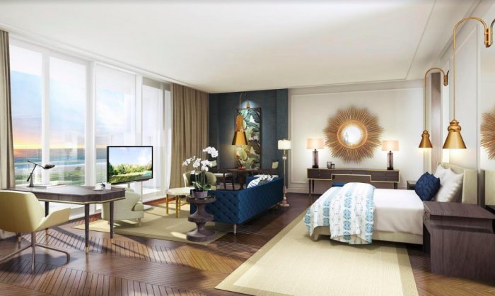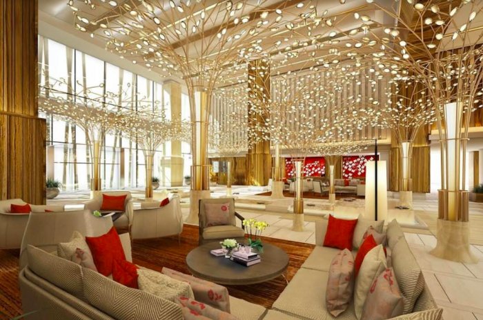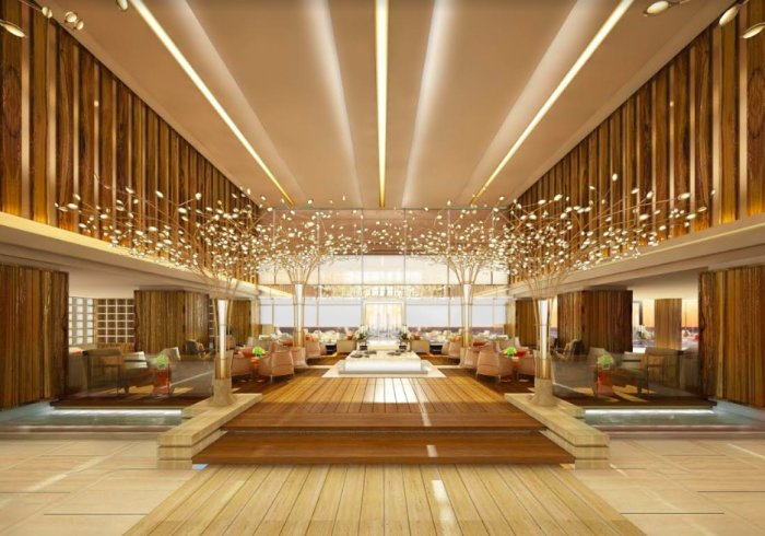 A magnificent lobby will welcome guests on arrival with a forest of lights leading to the beach front. Fourteen bronze metal trees standing seven, eight and nine metres high – each with 900 lights – create a canopy of crystal and light that glisten and sparkle, just like the nearby ocean. The expansive space opens up onto an outdoor area comprising water features, walkways, stone bridges and teak decks creating a path to the shoreline.