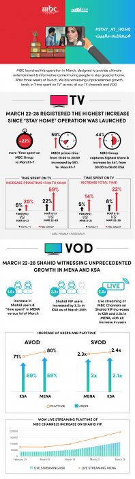 After three weeks, the region’s leading broadcasters have witnessed unprecedented growth levels in “time spent on TV”, across all of their TV channels and VOD. The period spanning March 22-28 registered the highest increase since the “Stay at Home “operation was launched.