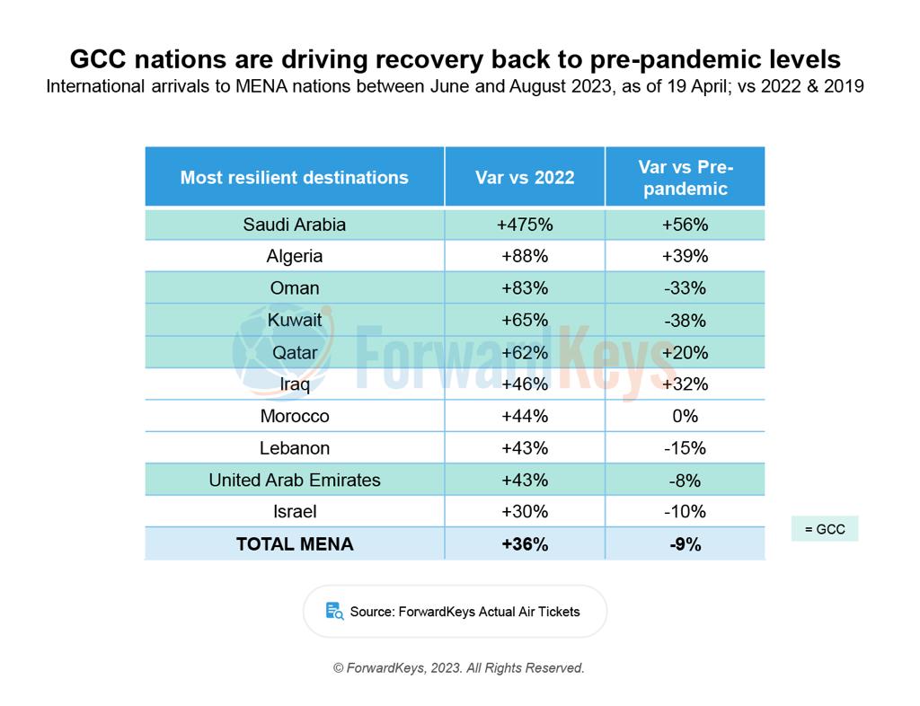 Ahead of the Arabian Travel Market (ATM) taking place this week in Dubai, ForwardKeys, the leading travel analytics firm, reveals a 36% increase in international arrivals into the MENA region between June – August this year versus the same period in 2022.