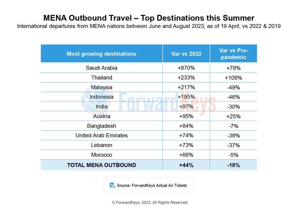 In terms of which source markets are the most engaged and interested in the MENA region, the latest air ticket data from ForwardKeys shows that the Egyptian market is pivotal, up by 109% on 2019 levels from June – August. The UK (United Kingdom) is also up, 28% above 2019 levels, and Australia, an important long-haul market, is down just by 5% compared to the pre-pandemic but up by 119% compared to 2022.