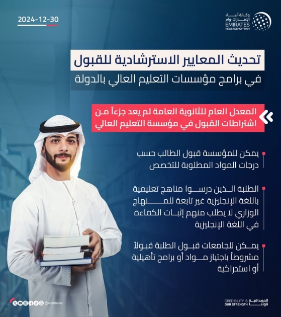 According to the update, the overall high school score is no longer a mandatory admission requirement for HEIs, as institutions can accept students based on the grades of the subjects relevant to their chosen major. Additionally, universities can require that students applying at the master’s or doctoral level hold an academic qualification from the previous level, in alignment with the National Qualifications Framework 2024. The decision also states that indicative secondary school grades refer to the grades of an educational curriculum certificate approved in the UAE under the advanced track or its equivalent according to the matrix in effect at the Ministry of Education.