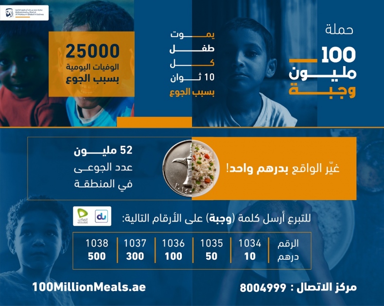The MBRGI, organizer of the ‘100 Million Meals’ campaign, was established in 2015, combining under its umbrella over 30 humanitarian and developmental initiatives and entities. The ‘100 Million Meals’ campaign falls under MBRGI’s Humanitarian Aid and Relief, one of the five pillars of the foundation’s operations that cover Healthcare and Disease Control, Spreading Education and Knowledge, Innovation and Entrepreneurship and Empowering Communities.
