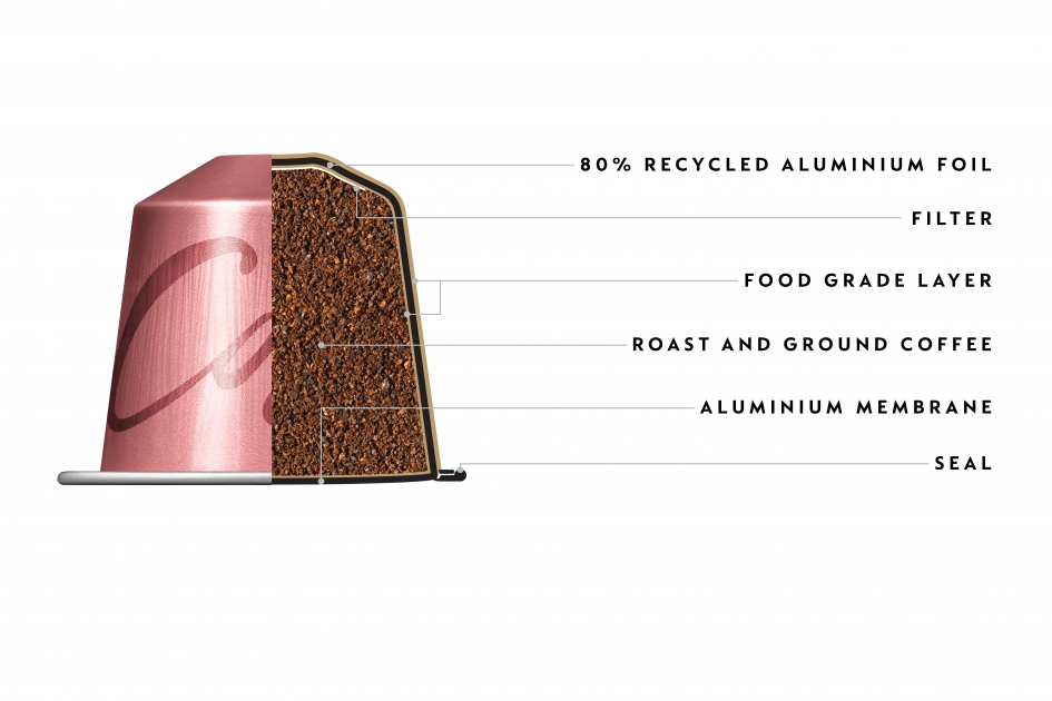 Aluminium is infinitely recyclable and is one of the most widely recycled materials in the world. Recycled aluminium requires less energy to produce than a virgin product, so it is well-suited to use in a circular business model. Aluminium also optimally protects the freshness and aromas of high-quality coffee, providing a perfect barrier against oxygen, light and humidity. Nespresso has always been using aluminium for its capsules for these reasons. Made of a thinner aluminium foil, each new capsule is produced using 9.2% less aluminium material, and is therefore 8% lighter.