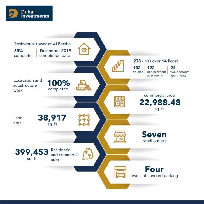 Dubai Investments PJSC has announced that the new residential tower at Al Barsha 1, developed by its subsidiary Dubai Investments Real Estate Company (DIRC), is 25% complete and on track for a scheduled completion date of December 2019, with excavation and substructure work on the project already 100% complete.