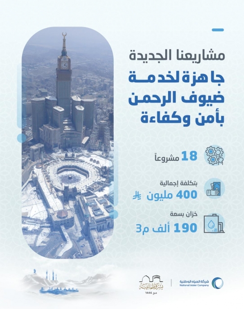 The company said that such projects will enhance operational efficiency and bolster water supply through rehabilitating some water storage facilities, pumps and network control systems, in addition to enhancing fire and cooling networks, enabling real-time monitoring of the water quality, activating proactive measures, increasing the capacity of wastewater and water distribution pipelines, and improving the efficiency of networks overall in Makkah and the Holy Sites.