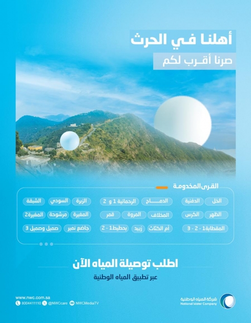 NWC called on its customers in Al-Hurrath Governorate and its affiliated villages (Al-Khall, Al-Dafniyah, Al-Demah, Al-Rahmaniyah 1 and 2, Al-Zabra, Al-Sudi, Al-Shabqa, Al-Dhahr, Al-Kars, Al-Makhlaf, Al-Marwah, Qamar, Al-Mughira, Al-Mughira 2, Al-Muqtaba 1, 2 and 3, Umm Al-Kathath, Bahtit 1 and 2, Jada'a Namir, Samil and Samil 3, Zebaid and Marshuha) to request the service through its official channels, whether through its mobile app or its e-branch: e.nwc.com.sa