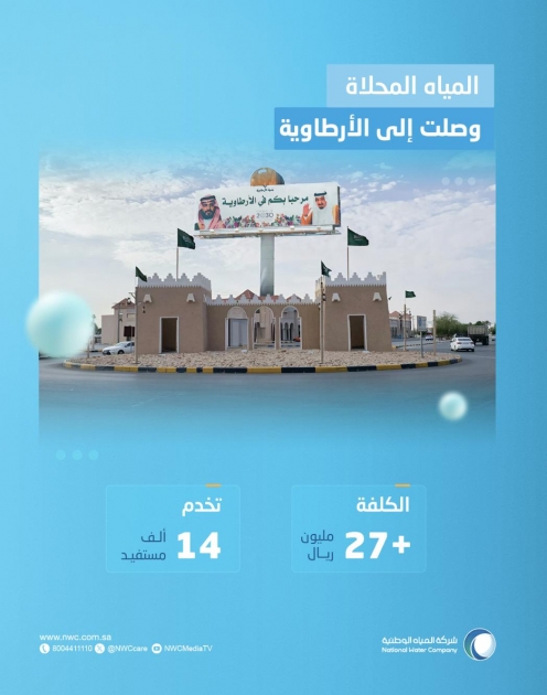 The company said, "We have completed the construction and operation of the drinking water treatment plant in Al-Artawiya Center. This is part of our continuous efforts to keep pace with the growing water demand, increase the efficiency of operations, and improve services to our valued customers. We will also continue to implement our strategic plans to qualify infrastructure in the ency of operations and improve services to our valued customers. We will also continue to implementing our strategic plans to qualify infrastructure in the areas of water and environmental services."