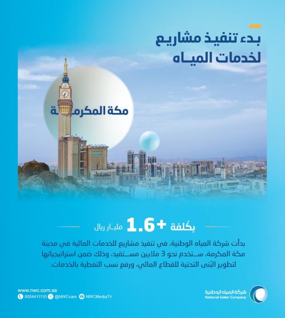 The National Water Company (NWC), represented by the Western Cluster, announced that it has started implementing water supply projects in the holy city of Makkah at a cost of more than 1.6 billion Saudi Riyals. These projects are part of NWC’s strategies to develop the infrastructure of the water and environment sectors and increase the coverage rates in cities and governorates.