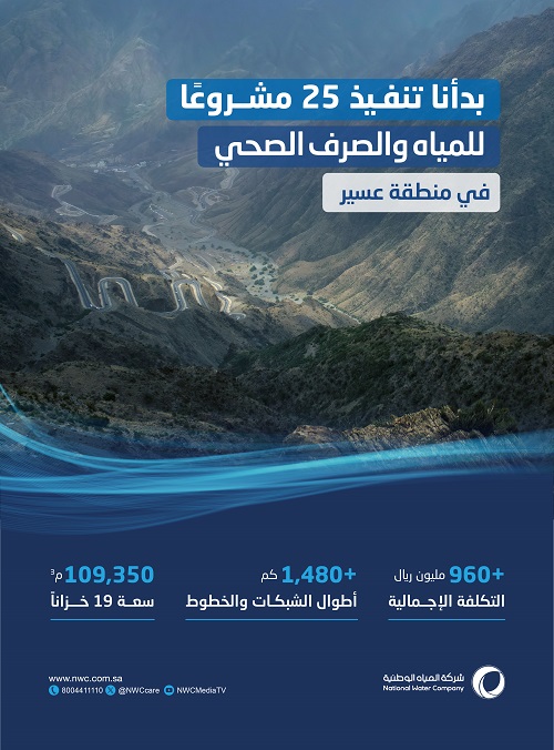 NWC said that the water projects it has started to implement are 23 projects in Asir region and its governorates. These projects will cover a number of districts in Abha city, Khamis Mushait, Bisha, Namas, Balqarn, Tarib, Sarat Ubaida, villages in Al-Amwah governorate, Samakh and Atif centers in Bishah governorate, Al-Zarq, Al-Wasit and Al-Hamda centers, Al-Hamidan building blocks and affiliated villages in Tathleeth. In these locations, transmission lines and networks with a length of more than 1,410 kilometers and 19 operational reservoirs with a total capacity of 109,350 cubic meters will be implemented at a total cost of more than 907 million Saudi Riyals.