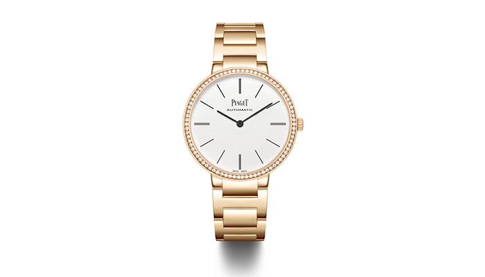 The traditional mechanism is ideally matched by the contemporary identity of the Altiplano collection. Its pure design combines up-to-the-minute chic with timeless elegance. Piaget was duty bound to interpret this iconic collection with a gold bracelet, a Fine Watchmaking classic. This elegant and urban new Altiplano, available in 34 mm and 38 sizes, is equally suited to men and women. The supple feel of the bracelet ensures a perfectly comfortable fit for all models, while its graceful curves smoothly extend the harmonious case aesthetic and understated dial. Ideal ergonomics, soft lines and an integrated clasp all contribute to its refined nature. The white gold versions feature a gem-set bezel, while the pink gold variations have a more restrained, polished bezel.