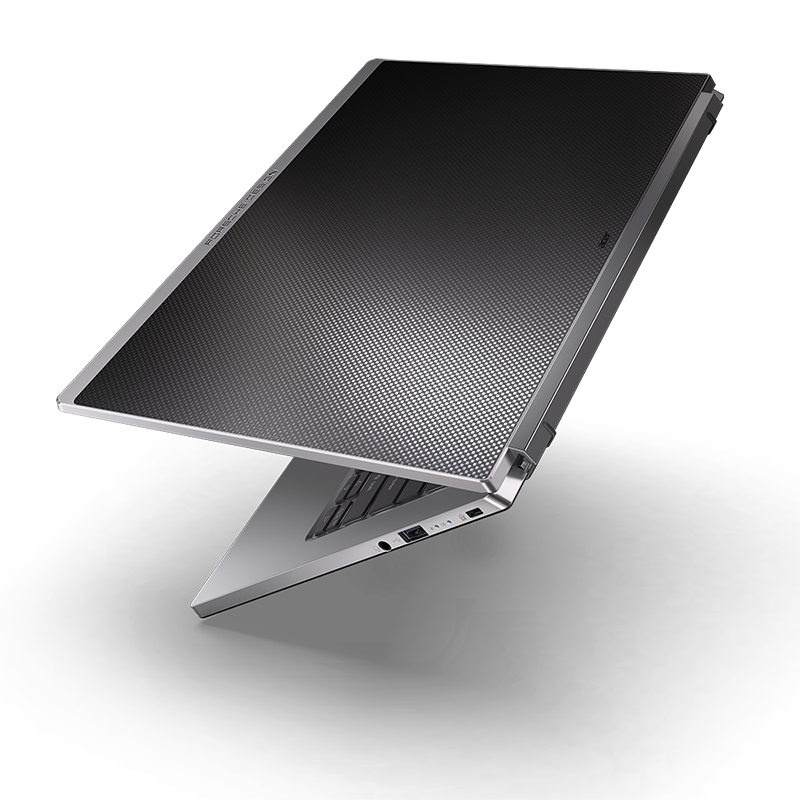 Following Porsche Design’s design philosophy of optimizing function, the Porsche Design Acer Book RS is a statement in refined computing in which every feature serves a purpose. A diamond-cut CNC-machined 3k carbon fiber cover stands out against the device’s silver-colored chassis, a contrast that provides a bold flair of character while also allowing for incredible portability; the entire unit is just 1.2 kg (2.65 lbs) light and 15.99 mm (0.63 in) thin. The two covers are connected by a unibody hinge that slightly elevates the keyboard upon opening the notebook, improving cooling and creating a more ergonomic typing experience. Backlit keys provide convenient typing, even at night, and the glass precision touchpad provides multi-gesture support for a more intuitive multitasking experience.