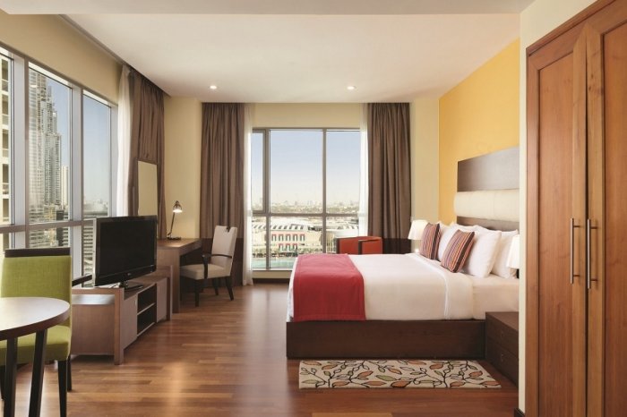 Ramada Downtown Dubai is located within the city’s vibrant commercial and tourist centre. The hotel provides a great view of Burj Khalifa, the tallest building in the world, and overlooks the spectacular Dubai Fountain. It is a short walk away from The Dubai Mall, as well as to a wide array of dining venues along Downtown Dubai. Its prime location makes it ideal for all types of guests – business travellers attending conferences and exhibitions, extended holidays for families, or guests on short Dubai getaway. The hotel offers a modern luxurious city suite living with its spacious accommodation and tasteful interiors complemented by an outstanding service. Guests can choose from a range of options including a junior suite, one-bedroom suite, two-bedroom suite and the luxurious four-bedroom penthouse. Kenza Restaurant, located at the hotel’s second floor, is an all-day dining venue that serves a delectable selection of local and international dishes. The hotel amenities include a well-equipped gymnasium and a large outdoor swimming pool where the guests can rejuvenate and relax amid the hustle and bustle of the city.