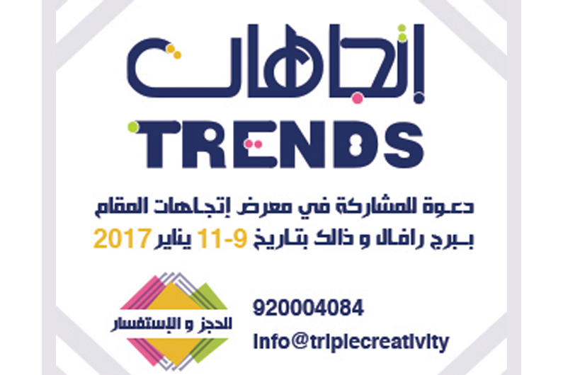 9th to 11th January 2017 at Burj Rafal Kempinski. Riyadh 4:00 PM to 11:00 PM. TRENDS has captured the attention of the most talked about celebrities & social media influencers.