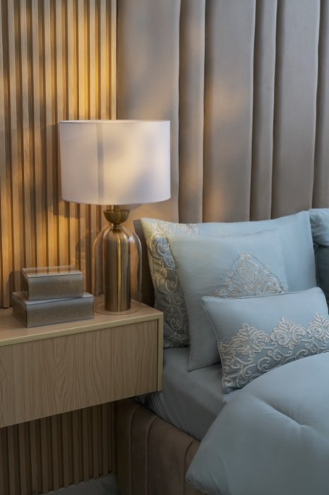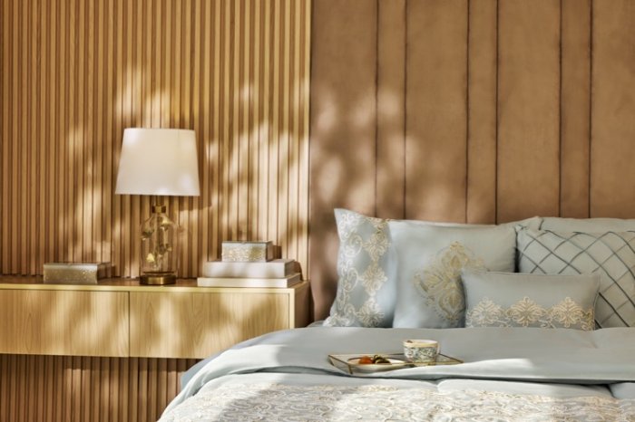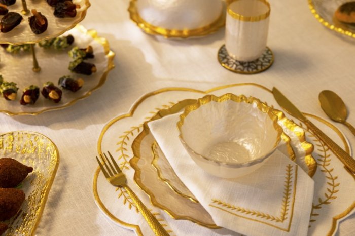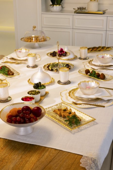 Craftsmanship is evident in exotic dinnerware consisting of serving trays, brass cutlery, and porcelain bowls in ivory white with golden edges. Decorated trays and luxury hammered-style glass cloches can house Suhoor and Iftar treats for indulgence in the Ramadan after-hours. Ceramic plates with golden leafy imprints will leave the guests feeling special, only for the new collection’s deluxe beddings to say the best is yet to come.