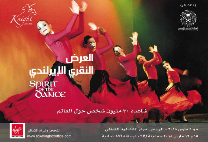 Spirit of the Dance will launch its tour in the kingdom with back to back shows in King Fahd Cultural Center in Riyadh on March 8th and 9th. The show will also be performed in King Abdullah Economic City in Jeddah on March 15th and 16th.