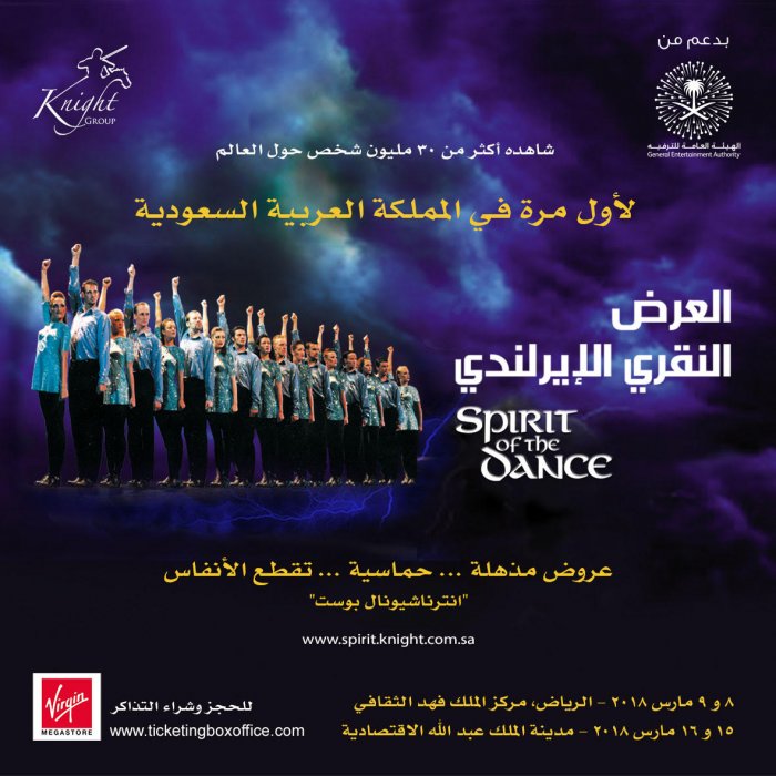 Under the patronage of the General Entertainment Authority in Saudi Arabia, Knight Group present for the first time in the Kingdom, award winning show, Spirit of the Dance. The River dancing show is the recipient of over 9 Global awards and has been seen by more than 30 million people around the world, making it one of the biggest and best dance shows to ever showcase. With exhilarating performances in over 20 countries and now in Riyadh and Jeddah, tickets are available through Virgin Megastore and through the ticketing box office.