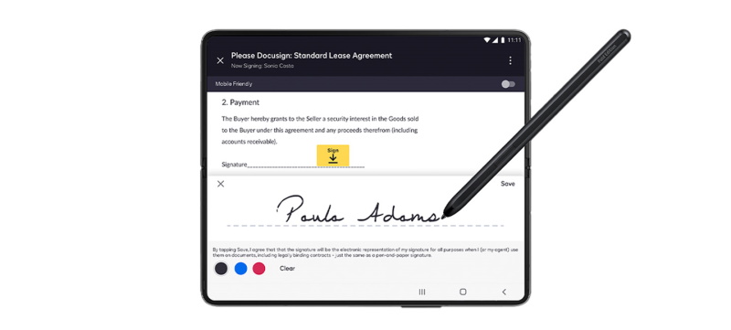 DocuSign,[7] which offers the world's leading e-signature solution and is used by 24 of the top 25 Fortune 500 Financial companies[8] has also been optimized for Android 12L. The Galaxy Z Fold4’s takes the hassle out of signing agreements on large screens. Users can now quickly drag and drop email attachments in multi-view mode directly into DocuSign eSignature, seal deals quickly on the go with Samsung's S Pen[9] and the dedicated Flex Mode signature.